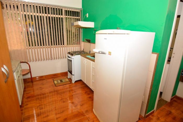 Mobiliado: geladeira, fogão, cama, mesa, cadeira, armários.